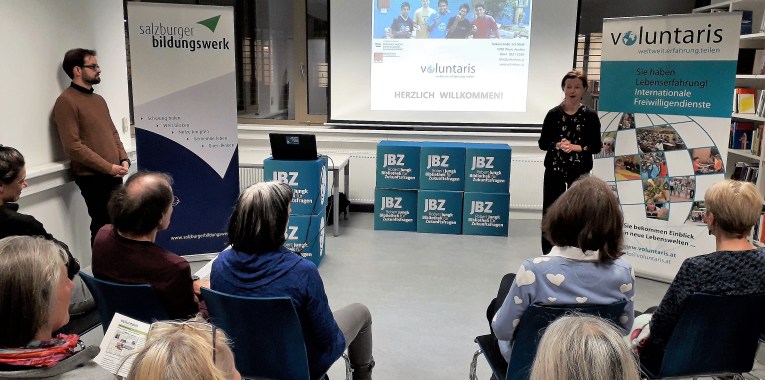 Drei Monate oder auch länger in einem Projekt der Entwicklungszusammenarbeit mitarbeiten und eigene Fähigkeiten ein bringen, das ist das Ziel der von VOLUNTARIS vermittelten Freiwilligeneinsätze. Dabei geht es um ein Geben und Nehmen, wie Georg Primas von VOLUNTARIS in einem Infoabend in der Robert-Jungk-BIbliothek gemeinsam mit dem Salzburger Bildungswerk in der Reihe „Projekte des Wandels“ betonte. Die Innsbrucker Physiotherapeutin Doris Gerster (im Bild unten) berichtete eindrucksvoll von ihrem Einsatz in Tanzania und Kenia und vermittelte den an die 20 Interessierten anschaulich, wie solche Einsätze ablaufen. Die Freiwilligen werden von VOLUNTARIS betreut. Es gibt eine gute Vor- und Nachbereitung. Besten Dank an die Referierenden sowie an Christa Wieland vom SBW für die Kooperation. Mehr Infos