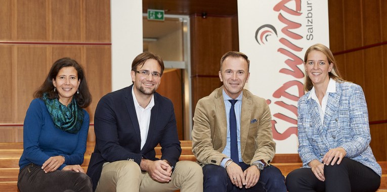 Foto (LMZ): Eröffnung der 17. Entwicklungspolitische Hochschulwochen in Salzburg, Verein Südwind feiert 40-Jahre-Jubiläum,im Bild: Anita Rötzer, Harald Madlmayr (beide Verein Südwind), Vize.-Bgm. Bernhard Auinger und LR Andrea Klambauer 05.11.2019