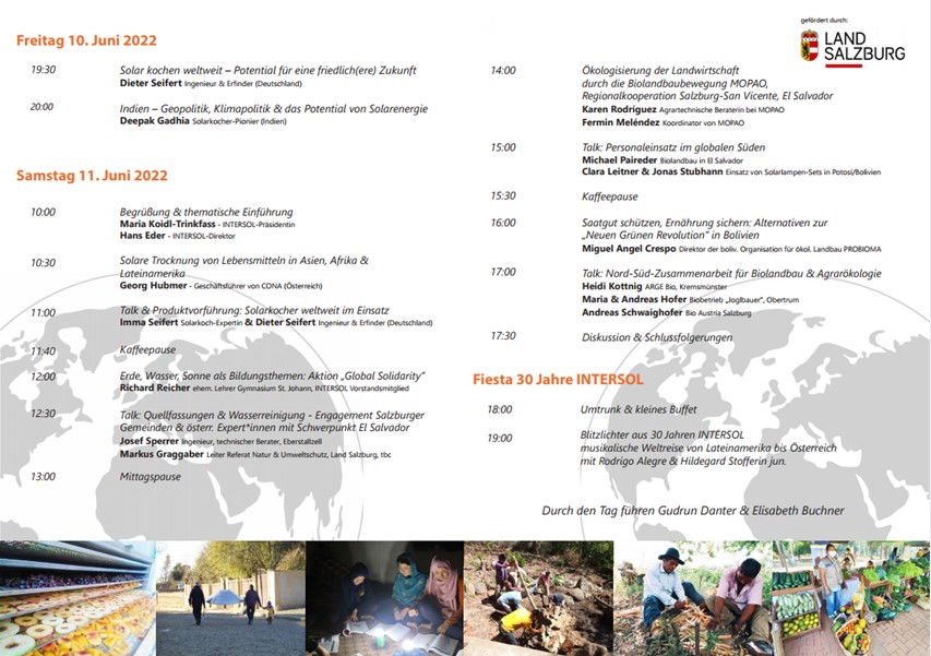 Der Verein INTERSOL feiert heuer sein 30jähriges Bestehen. „30 Jahre Engagement für gelebte Solidarität und Partnerschaft auf Augenhöhe hat uns immer wieder herausgefordert neue Wege zu beschreiten und neue Kooperationen einzugehen, hier in Österreich und in unseren Partnerländern im Süden. Unserem Ziel sind wir treu geblieben: das buen vivir zu ermöglichen, gemeinsam für eine bessere Zukunft und das Gemeinwohl aller zu arbeiten!“, heißt es in der Einladung. Ebenso seit 30 Jahren engagiert ist die Gruppe „Helfen durch teilen“ in Straßwalchen in der Region Babati in Tansania. Wir gratulieren herzlich! Mehr zu den Jubiläumsveranstaltungen findet ihr in den Links sowie in den untenstehenden Programmen.