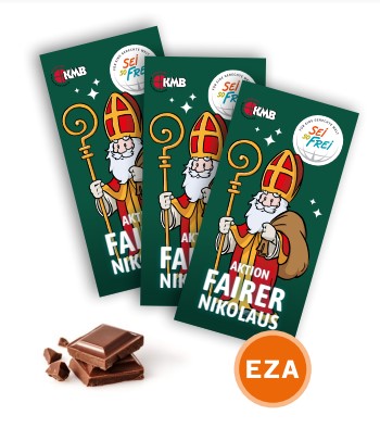 Im Rahmen der Aktion „Fairer Nikolaus“ besucht Sei So Frei jedes Jahr rund um den 6. Dezember Schulen und Kindergärten, wie auch Persönlichkeiten aus Politik, Wirtschaft, Kirche und Medien, um diese besonderen Schokoladentäfelchen zu verteilen. Für die Nikolausaktion 2023 in Kooperation der EZA GmbH werden Entwürfe für die Schokoladenverpackungen gesucht. Alle Einsendungen werden auf der Webseite von „Sei so frei“ im Advent 2023 veröffentlicht! Der oder die Gewinner*in wird natürlich kontaktiert, bitte dafür die Angabe der Kontaktdaten nicht vergessen.