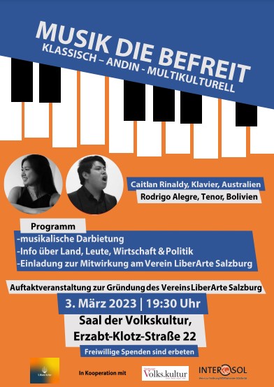 „Musik die befreit – klassisch – andin – multikulturell“, so das Motto eines Konzertabends, der durch das Forum Salzburger Volkskultur des Landes Salzburg unterstützt wird und in Kooperation mit Intersol stattfindet. In Zusammenhang damit steht die Initiative/Sondierung der Gründung eines Salzburger „Ablegers“ des bolivianischen Vereins „LiberArte“. Termin ist der 3.3.2023 um 19:30 im Saal der Volkskultur, Erzabt-Klotz-Straße 22. Freiwillige Spenden sind erbeten