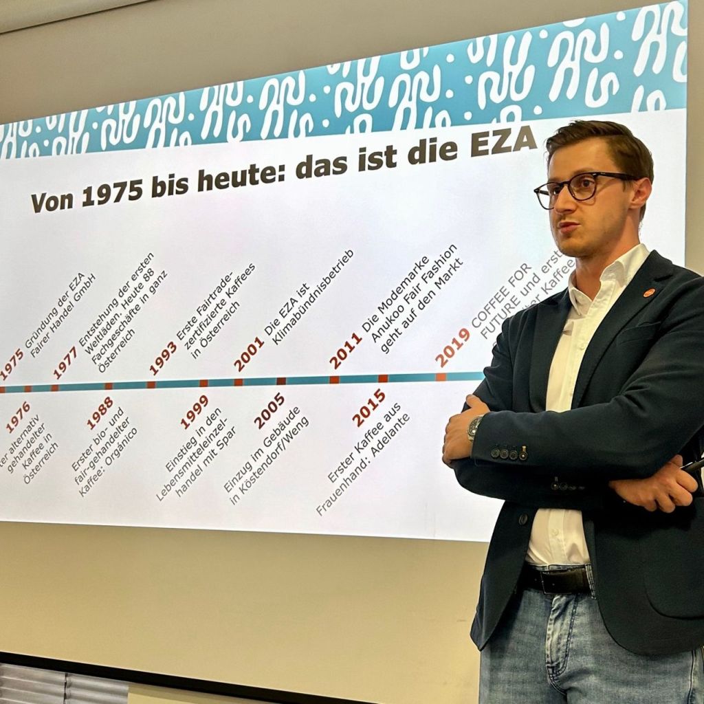 Michael Scherndl, der Geschäftsführer von EZA, gewährte uns umfassende Einblicke in die Philosophie und Praxis des Unternehmens. Sein Vortrag über die Nachhaltigkeit in der Produktion von Waren aus dem Globalen Süden, insbesondere im Kaffeeanbau, sowie die Gleichberechtigung von Frauen, beleuchtete die tiefgreifenden Auswirkungen des Fairen Handels.