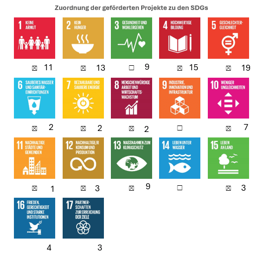Erstmals wurden 2025 die Antragstellenden gebeten, ihre Projekte den Sustainable Development Goals (SDGs) zuzuordnen. Die meisten Nennungen bezogen sich auf SDG 5 „Geschlechtergerechtigkeit“ (19 x) und SDG 4 „Hochwertige Bildung“ (15 x), gefolgt von SDG 2 „Kein Hunger“ (13 x), SDG 1 „Keine Armut“ (11 x) sowie SDG 9 „Maßnahmen zum Klimaschutz“ (9x) und SDG 10 „Weniger Ungleichheit“ (7x).